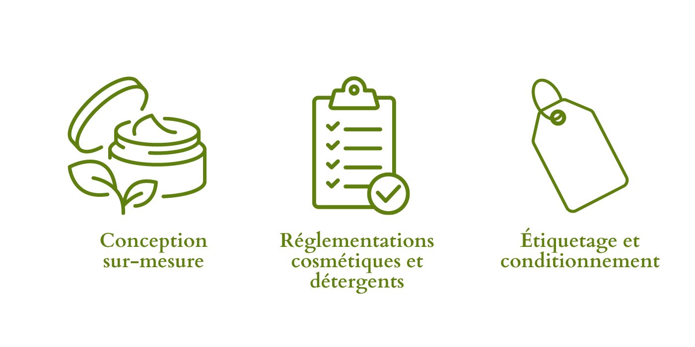 Nous effectuons des tests en fonction de votre cahier des charges préalablement validé, nous vous envoyons des échantillons et nous vous aidons dans la création des outils réglementaires (DIP, CPNP...). Nous pouvons également vous aider dans le choix de l'étiquetage et du conditionnement !